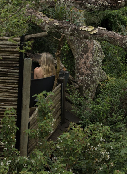 Guests can take in the ambiance of the surroundings from the outdoor braai area or alternatively make use of the gas cooker in the kitchen for all their cooking needs. An outdoor shower and bathtub carefully nestled amongst the forest trees embraces an intimate experience with nature to the sound of evening birdsong.